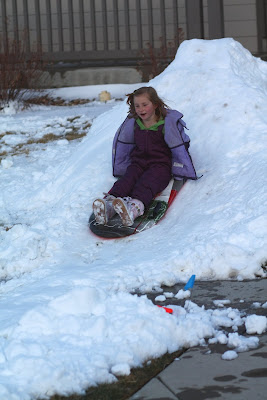 The girls and I headed out Fri. morning with every intention of making a snow sculpture...once out there I couldn't resist turning a large mound of snow into an even larger mound and having the girls slide down it.