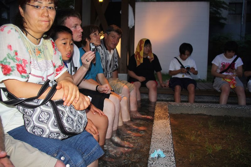 Next, we headed to a hot spring to soak our feet. The water was pretty dang hot, but if felt nice to sit and relax after I kicked Justin's butt earlier. It was at a hotel, and there were people eating outside in cute little hut things at the restaurant. It was a beautiful place and very peaceful with the light rain that was coming down.